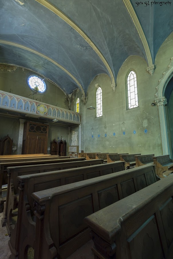 Este lugar fue apodado por otros exploradores como "La capilla azul" debido al tono azulado de la luz teñida por las cristaleras de la zona cercana al altar.