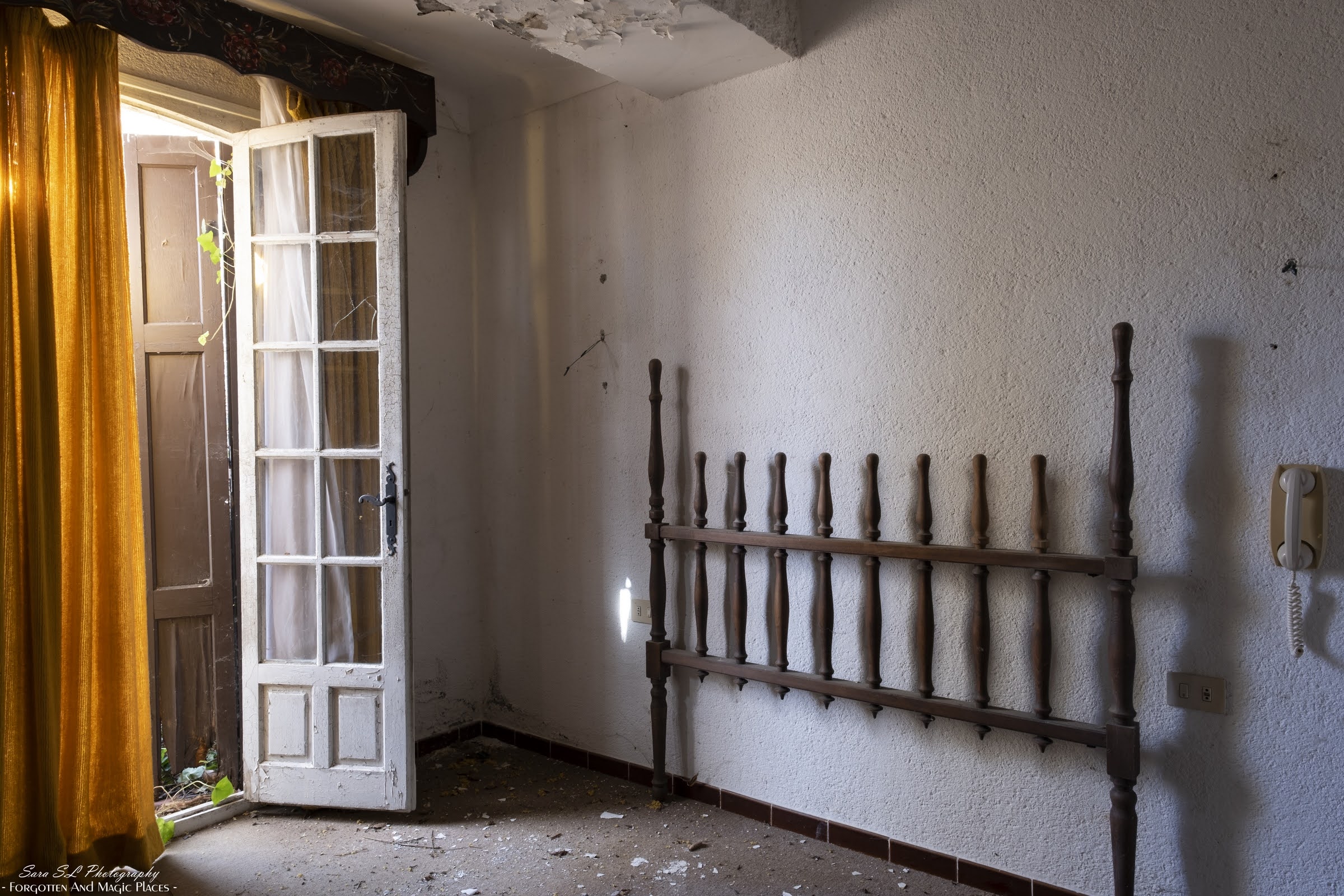 En esta otra habitación el suelo se estaba hundiendo y hasta la cama se veía torcida, la encuadré como pude sin entrar.